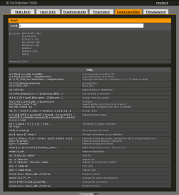 - Имеются подсказки для популярных Unix команд. Работа с файлами - копирование (cp), переименование/перемещение (mv), удаление (rm) файлов. Назначение прав (chmod) и пользователей (chown) на файлах. Создание (mkdir), удаление (rmdir) директорий. Вывод списка файлов (ls), поиск файлов (find), архивирование (tar, gzip). Просмотр места на диске (df). Процессы - показ (ps, top), снятие (kill, killall). Трассировщики и отладчики процессов (ktrace, truss, strace, gdb). Работа с IPC - показ (ipcs) и удаление (ipcrm).